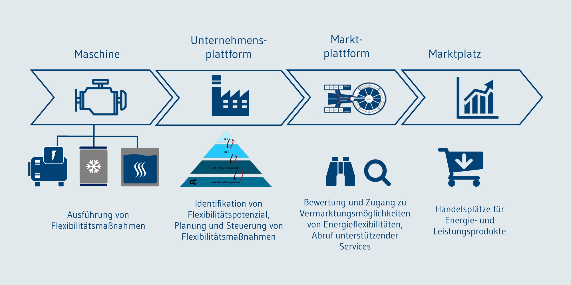 Die Energiesynchronisationsplattform gliedert sich in zwei Teilplattformen, die Unternehmensplattform und die Marktplattform, die über eine Schnittstelle zum Datenaustausch und zur Interaktion befähigt sind. Die Energiesynchronisationsplattform beschreibt damit das Zusammenspiel mehrerer Unternehmensplattformen auf einer zentralen Marktplattform, um informationstechnisch unterstützten Energieflexibilitätshandel transparent durchzuführen. Eine Unternehmensplattform bietet hierfür in einer service-orientierten Infrastruktur die notwendigen Funktionalitäten für die informationstechnische Anbindung und die Ansteuerung von energieflexiblen Produktionsprozessen und -infrastruktur. Die Marktplattform kann als multilaterale Plattform bezeichnet werden, die es ermöglicht, verschiedene Energieflexibilitätsmärkte und Services anzubinden und anzusteuern.