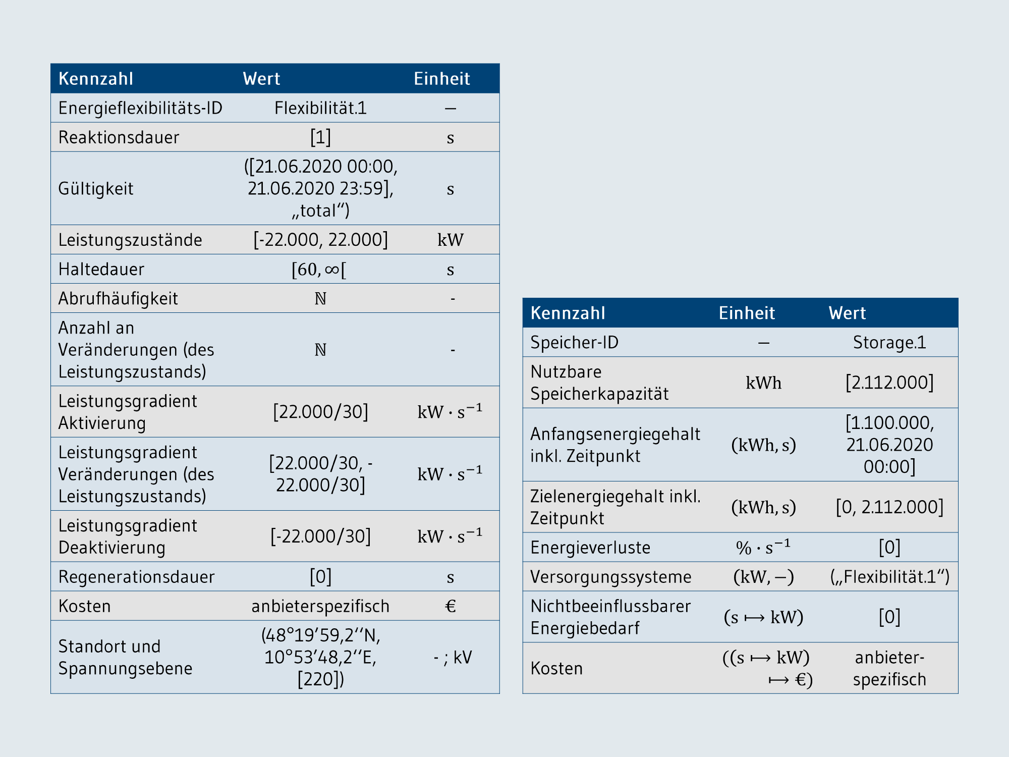 Beispielhafte, ausgewählte Werte des Energieflexibilitätsdatenmodells einer virtuellen Batterie modelliert mit Hilfe einer flexiblen Leistung und einem Speicher