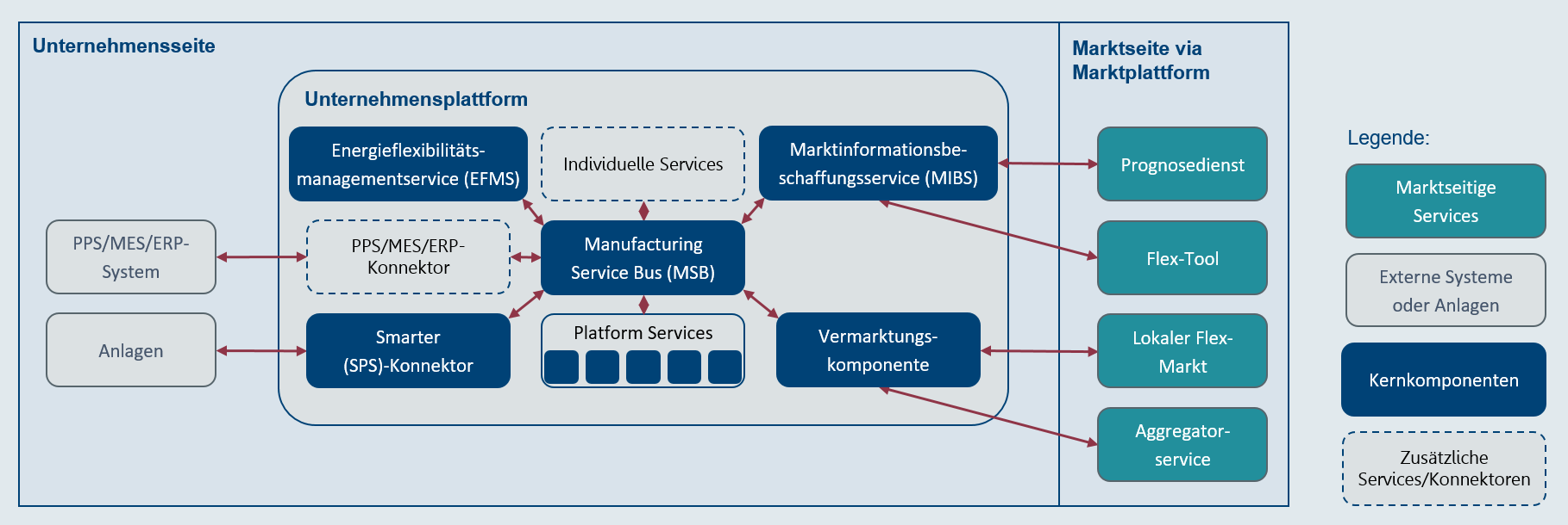 Die Energiesynchronisationsplattform sieht mehrere parallel existierende Unternehmensplattformen vor, welche z.B. die Flexibilität von angeschlossenen energieflexiblen Anlagen und Prozessen bereitstellen. Für die Bereitstellung und Orchestrierung sind verschiedene Services auf der Unternehmensplattform notwendig. Demgegenüber steht als Intermediär eine mit allen Unternehmensplattformen über eine uniforme Schnittstelle kommunizierende Marktplattform. Durch den Aufbau der Marktplattform als multilaterale Plattform wird für Unternehmen der Zugriff auf eine Vielzahl existierender und zukünftiger Märkte sowie Plattformen und unterstützender Services ermöglicht. Damit Unternehmen Flexibilität vermarkten können, werden auch über die Marktplattform verschiedene Services bereitgestellt und ausgeführt. Diese unterstützen die Unternehmen in verschiedenen Aspekten der Flexibilitätsbereitstellung, der Flexibilitätsbewertung und des Energieflexibilitätshandels.